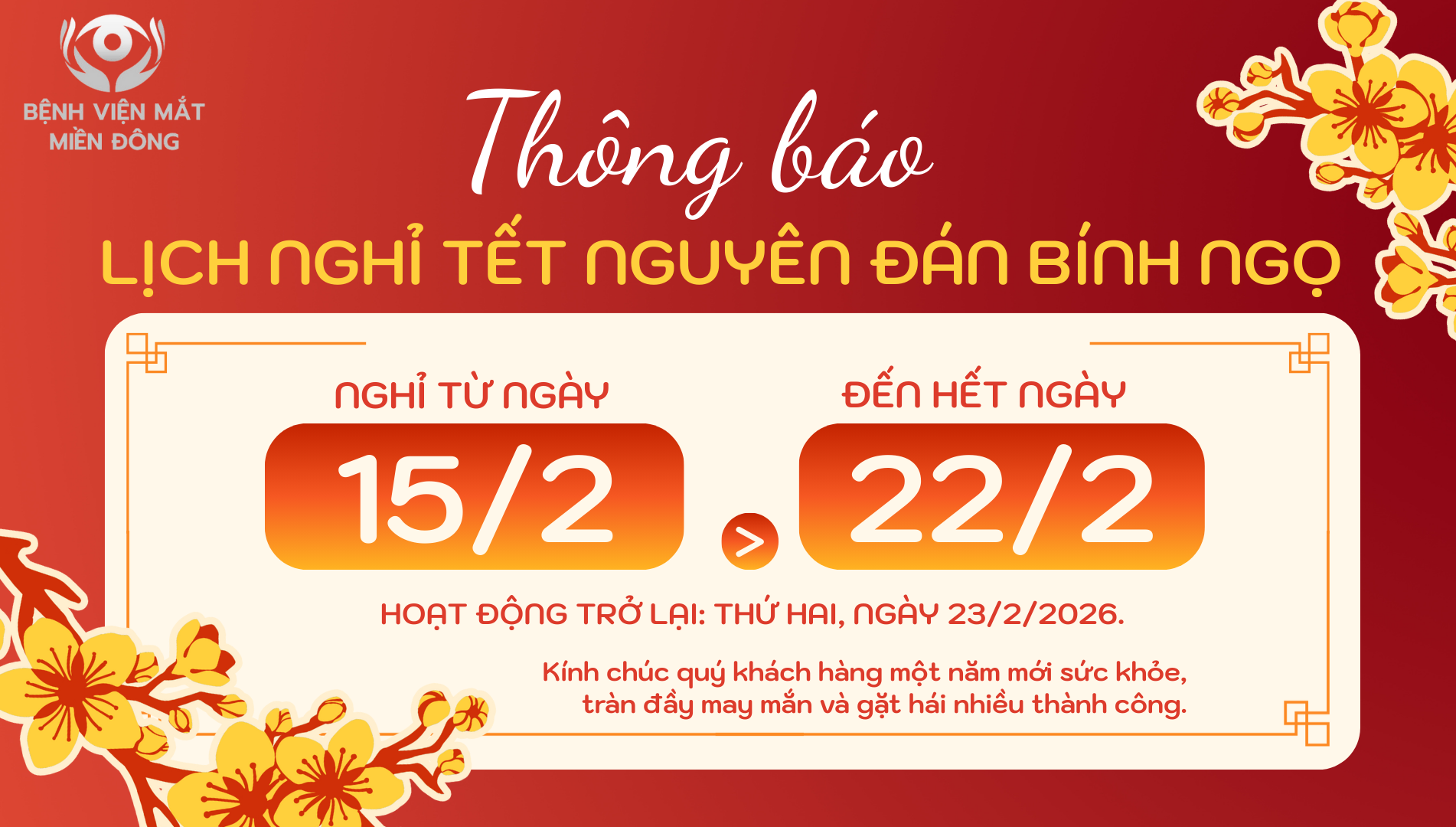 Bệnh viện kính mong Quý Khách hàng và Quý Đối tác chủ động sắp xếp thời gian thăm khám phù hợp. Mọi bất tiện phát sinh trong thời gian nghỉ lễ, Bệnh viện Mắt Miền Đông rất mong nhận được sự thông cảm và chia sẻ.